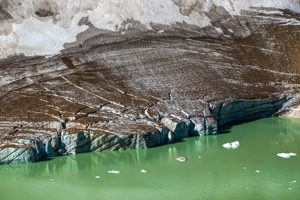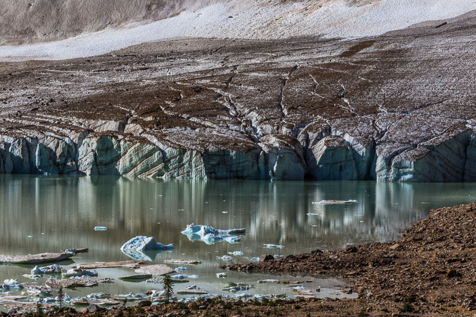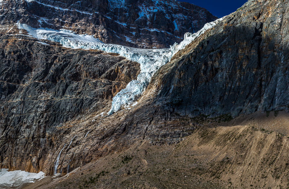 A close up view of the north face of Mt. Edith Cavell is visible after a short hike to Cavell Meadows. The hanging Angel Glacier is visible from Cavell Meadows, which spills over a 300 metres (984 ft) cliff on the north face. The remnants of Ghost Glacier, which fell in August 2012 can still be seen high on the mountain
