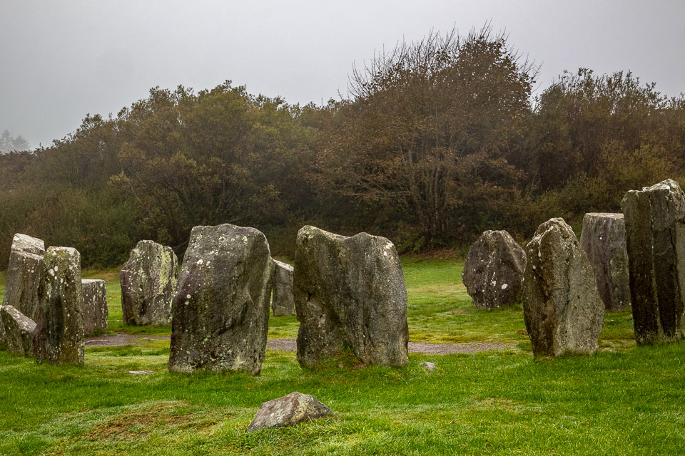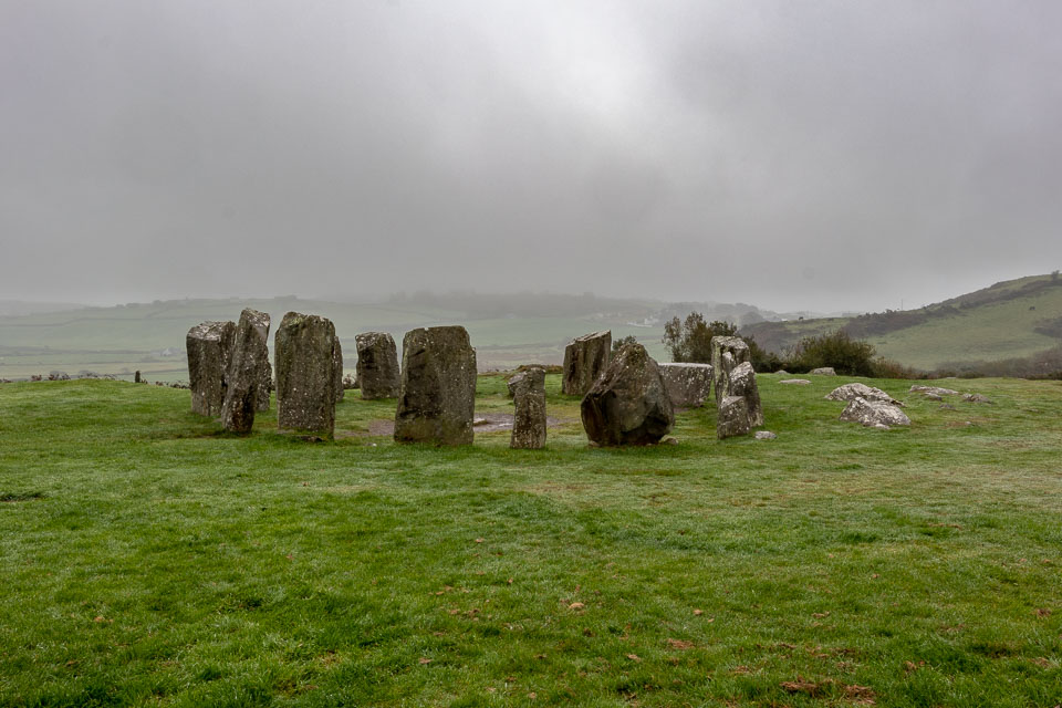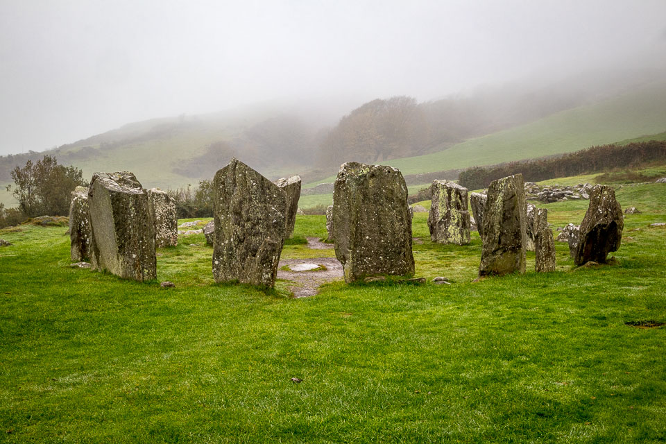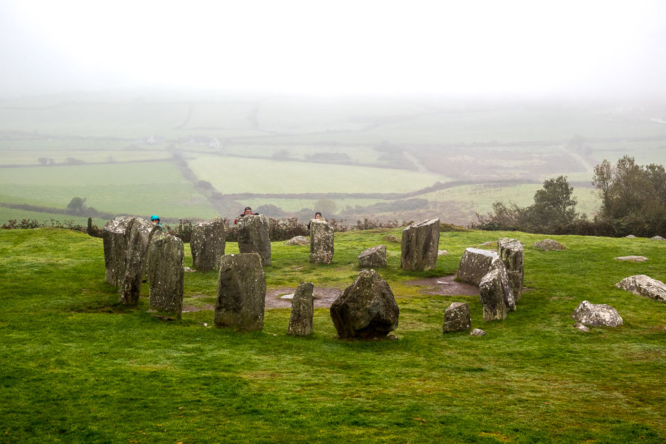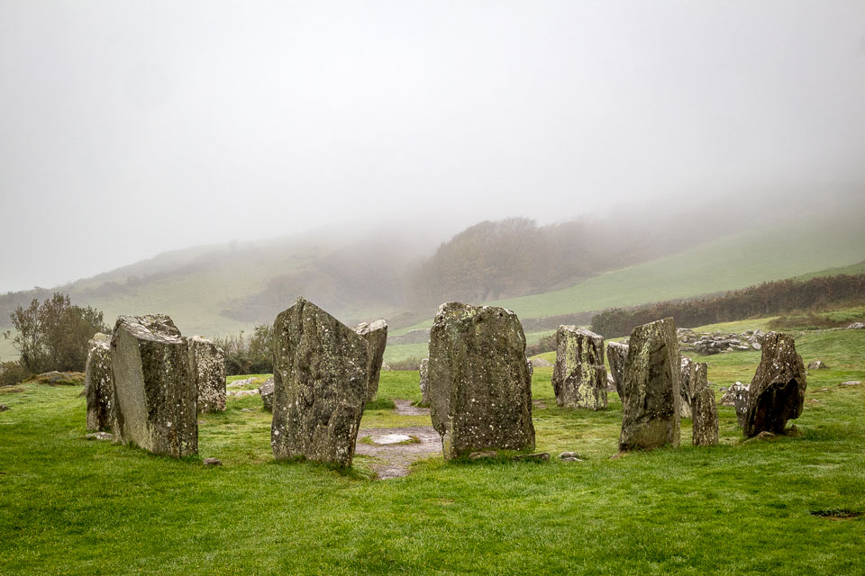 Drombeg Stone Circle: AKA The Druid's Altar, is probably Ireland's most famous stone circle. The stone circle consists of seventeen closely spaced stones spanning 9.3 metres in diameter, of which 13 survive. The most westerly stone is the long recumbent and has two egg shaped cup-marks, one with a ring around it. A "Cork-Kerry type" stone circle, it is flanked by a pair of axial portal stones, which provide a south-west axis, and orient the monument in the direction of the setting sun during the midwinter solstice