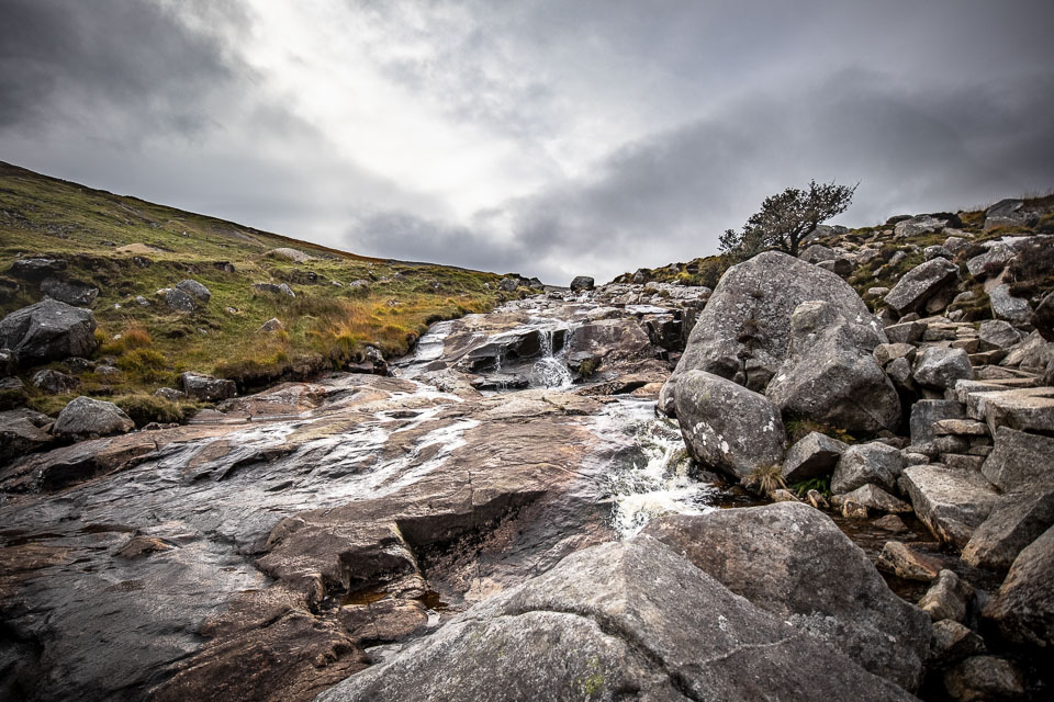 The trail we took (The Spinc trail, the white dots on this map ) climbs up and around the upper lake. The trail first goes though the ruins of Reefert church then climbs steeply up by the Poulanass Waterfall before joining a boardwalk. More than 600 wooden steps lead you to a viewing point overlooking the Upper Lake. A 3 mike long boardwalk skirts the top of the cliffs before descending through blanket bog and heath into the picturesque Glenealo Valley, home to a large herd of deer. A rough track then leads you back down into Glendalough Valley.