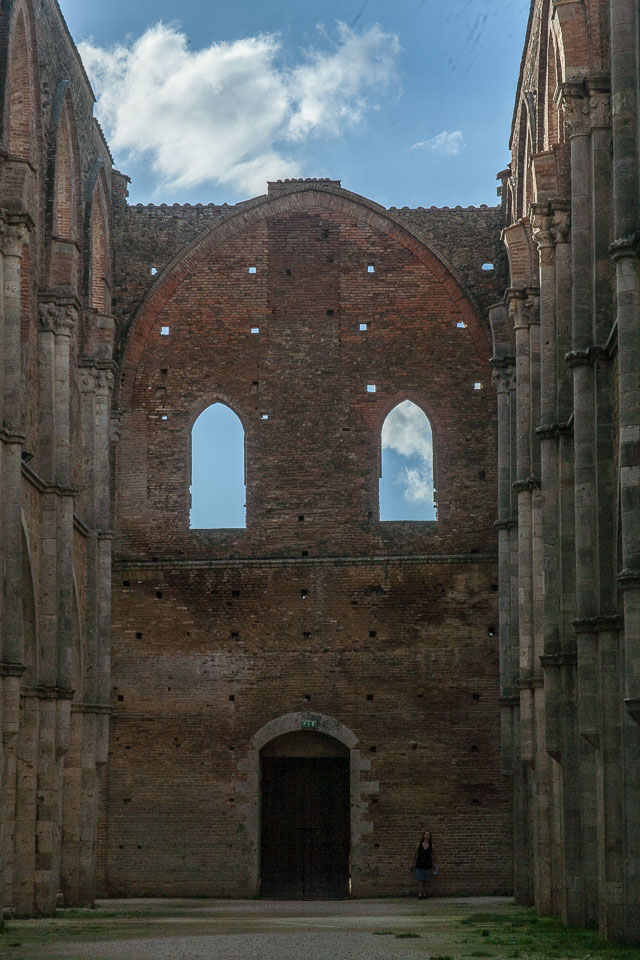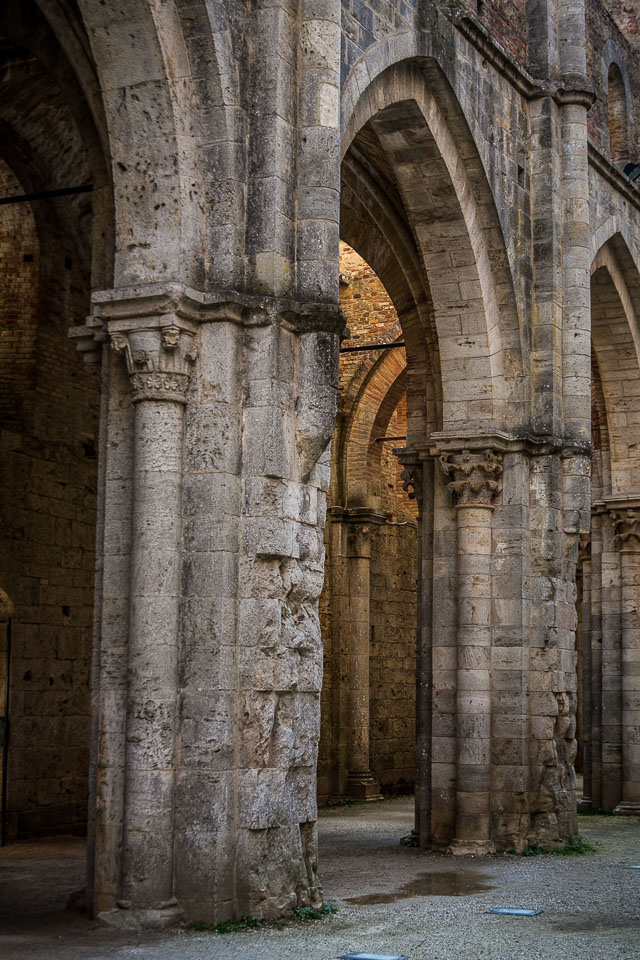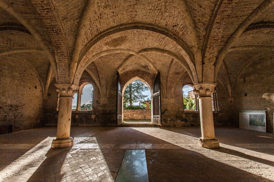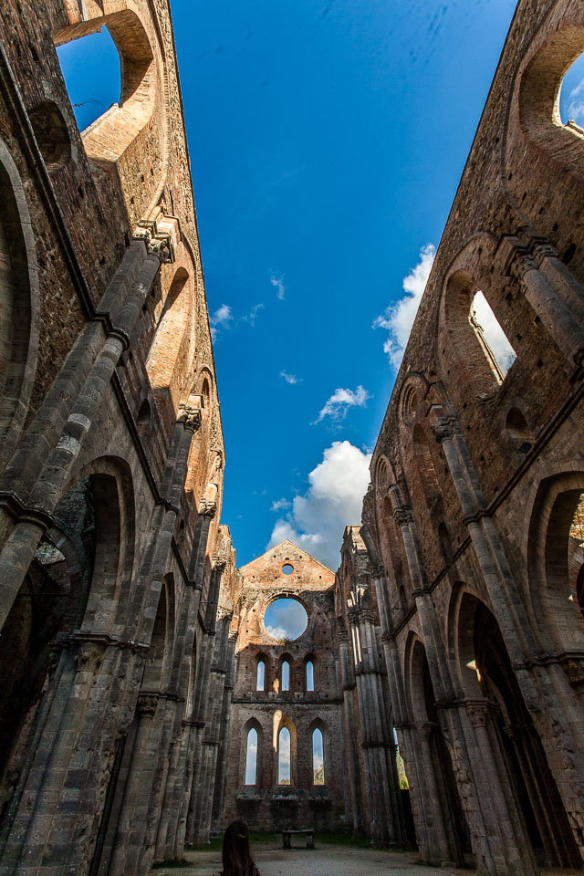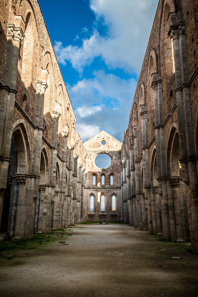 The original nucleus of the monastic complex Cistercian of Saint Galgano (Galgano Guidotti 1148-1181) is the hermitage of Montesiepi, built in Roman style as mausoleum of the Saint between the 1182 and the 1185. The hermitage began too small to contain the monks and the pilgrims, so in 1218 was decided to begin the construction of a new imposing Abbey in the plain below. The Abbey was built in the classic gothic forms of all the other Cistercian constructions, with plan at Latin cross with three aisles, rich of carved capitals and rose-windows, cloister, halls, bell tower. The abbey declined in the 16th century due to a long period of corruption that culiminated with an abbot selling the lead from the church roof, which soon collapsed. In the 1789 the great Abbey was definitively abandoned and become an enormous quarry of stones and columns for all the buildings of the area. Although the roof is still missing and the cloister has mostly disappeared, the abbey remains remarkably intact today.