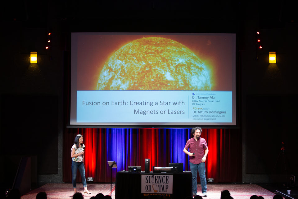 Fusion is the reaction that powers the sun. If controlled thermonuclear fusion can be harnessed here on Earth, it would provide a clean, sustainable, limitless energy source for all humankind. This is a grand scientific challenge, and scientists and engineers around the world are getting closer than ever. But how do you actually create a miniature star on earth? There are two options — magnets or lasers — but which one is best? At this Science on Tap, join us to learn about what fusion is, how we could use it, and hear two different ideas for how to make it. On the laser side, Dr. Tammy Ma, experimental plasma physicist from the Lawrence Livermore National Laboratory. On the magnet side, Dr. Arturo Dominguez, from the Science Education Department at the Princeton Plasma Physics Lab. Come learn plasma, fusion, possibilities for clean energy, and see some exciting demonstrations as well!