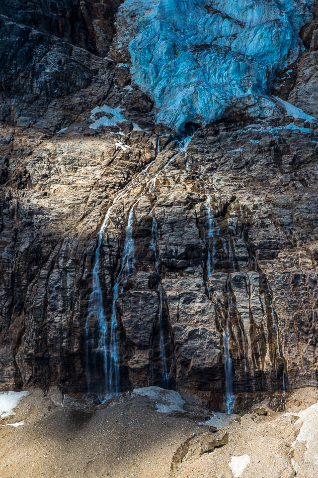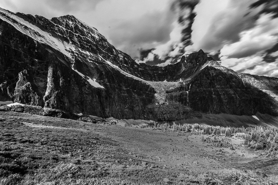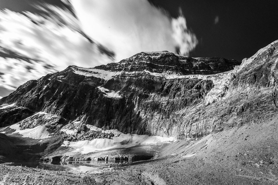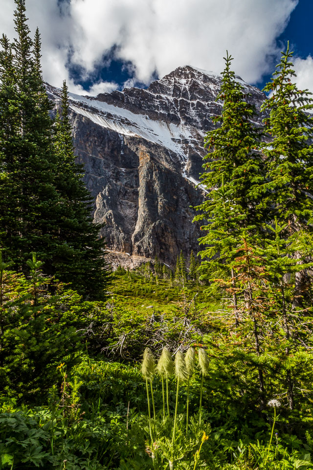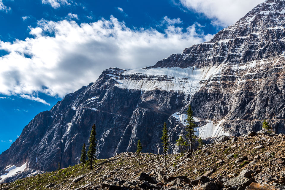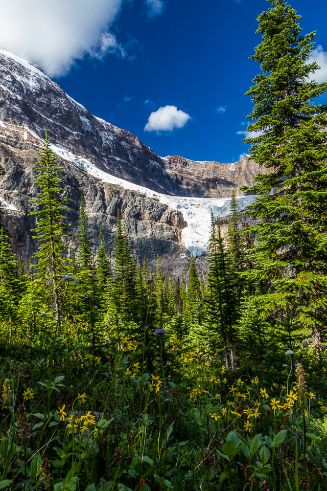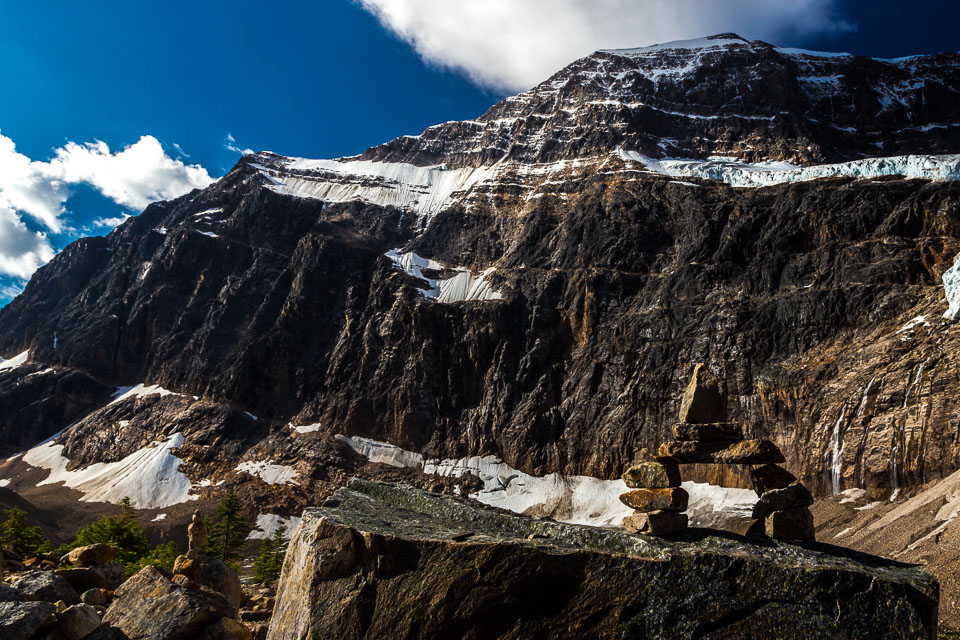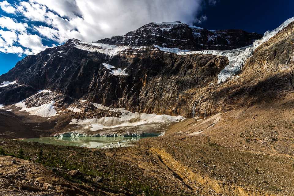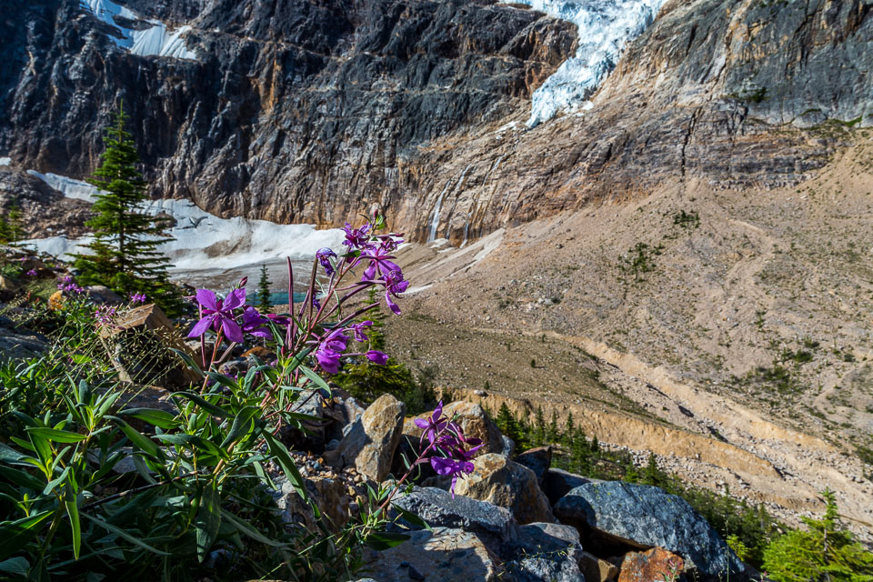 A close up view of the north face of Mt. Edith Cavell is visible after a short hike to Cavell Meadows. The hanging Angel Glacier is visible from Cavell Meadows, which spills over a 300 metres (984 ft) cliff on the north face. The remnants of Ghost Glacier, which fell in August 2012 can still be seen high on the mountain