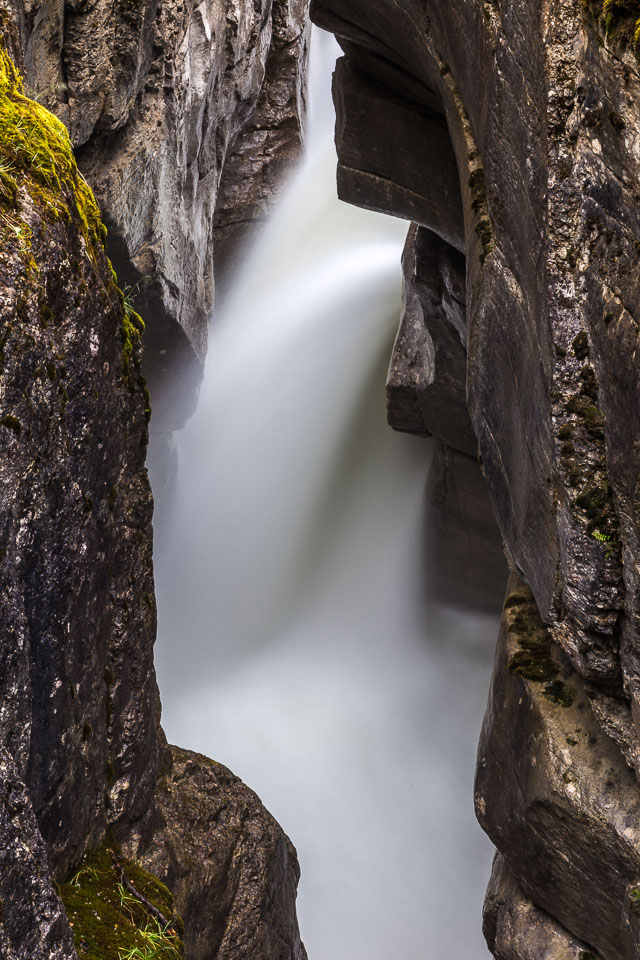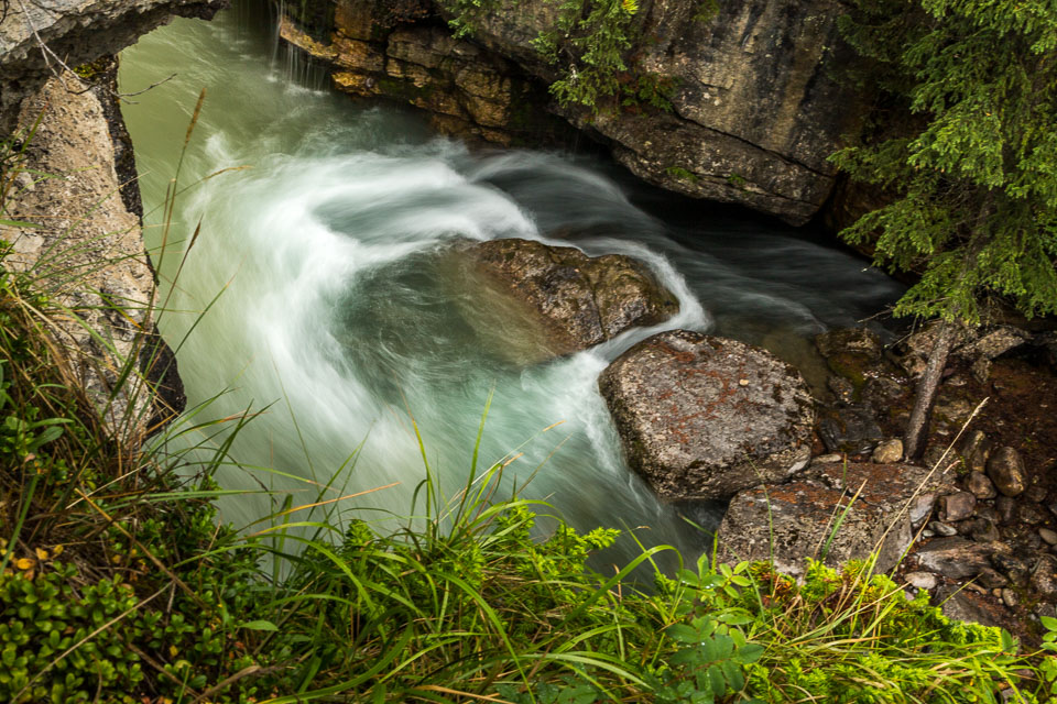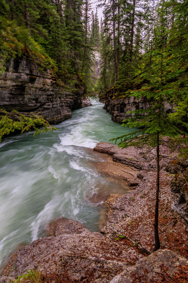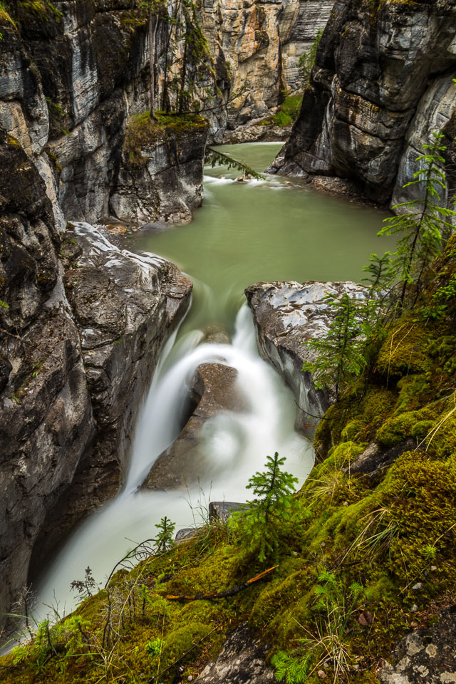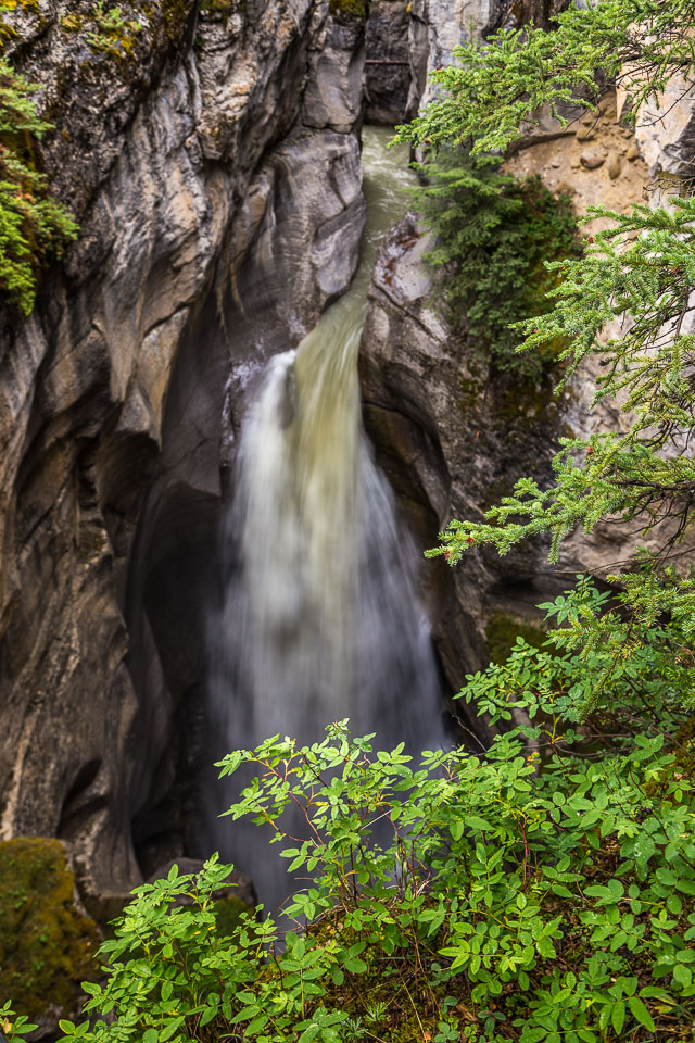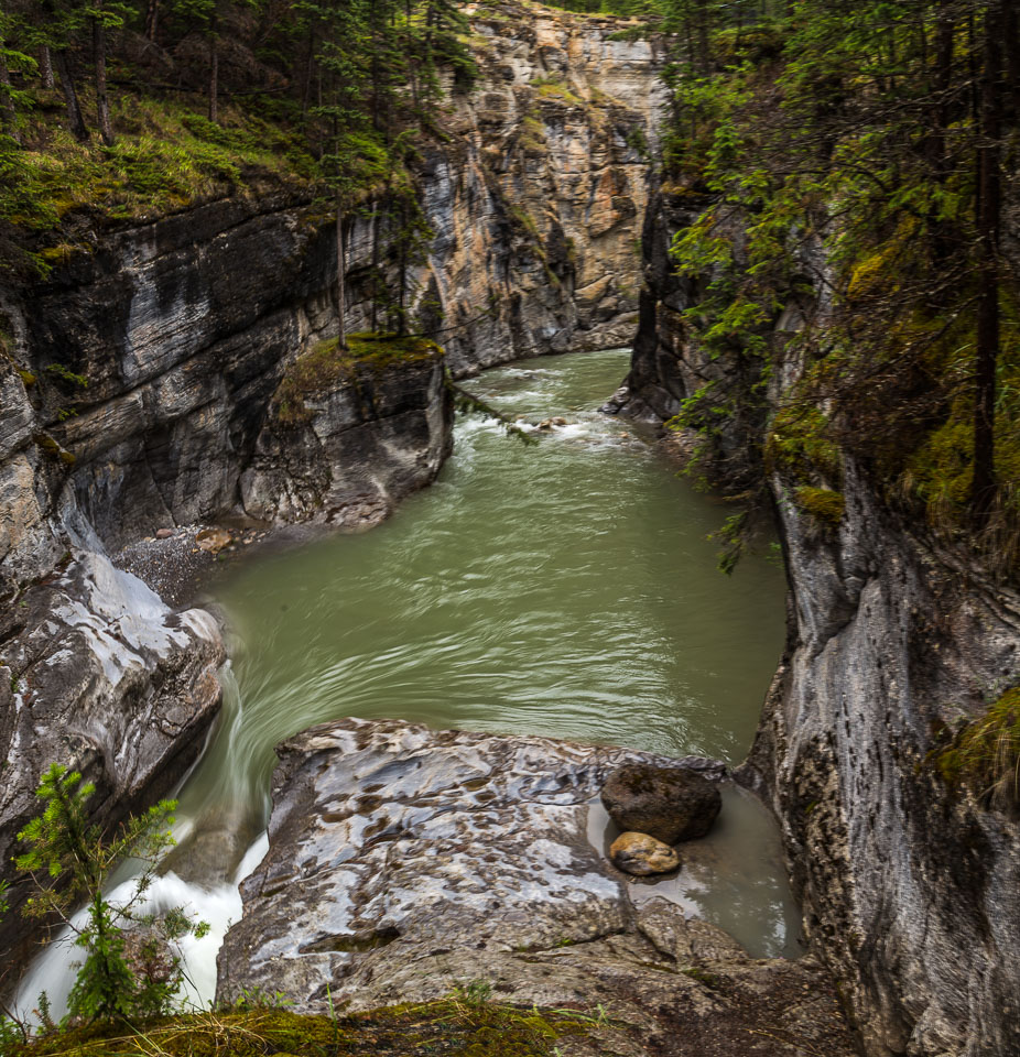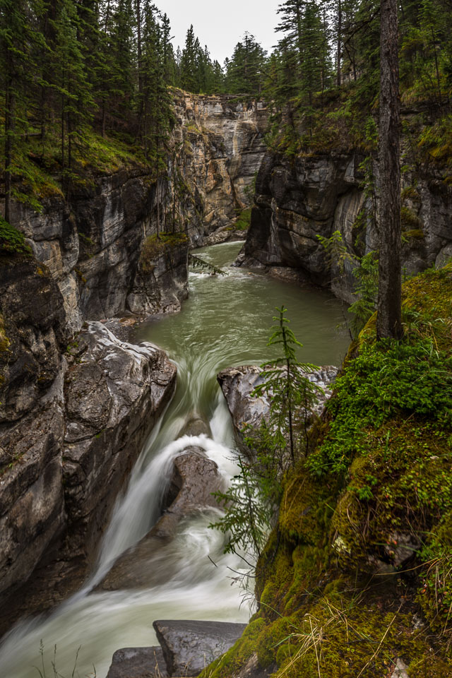The Maligne River ('maligne' is french for 'malignant' due to the difficulty of crossing) has carved itself the deepest slot canyon in the Canadian Rockies.