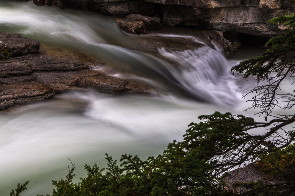 Flowing out of Medicine Lake, the Maligne River flows about 15 kilometers upstream as a full size river, but very quickly disappears into seeps in the ground and completely vanishes from the surface not far from the lake for most of the year. The smaller streams that feed the valley below that point rebuild the river by the time it reaches the top of the canyon. As the river drops down into the canyon it intersects the bedrock layers where the underground waters flow. Numerous large underground streams join and greatly increase the flow.