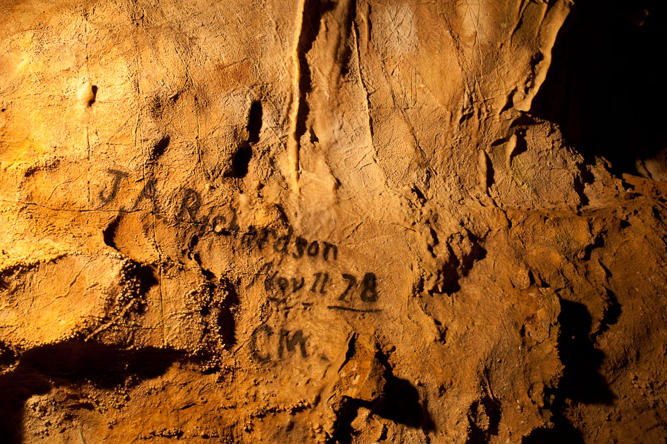 The Lake Shasta Caverns are a network of caves located near the McCloud arm of Shasta Lake in California. It was formerly named Chalk Cave and Baird Cave, named after Spencer Fullerton Baird. The caverns are dated at least 200 million years, and were formed by flowing water. Over the years this water drained leaving the caverns seen today. The caves are made entirely of limestone, and feature every type of possible formation, including stalactites, stalagmites, soda straws, columns, and flowstone. The Discovery Room, one of eight known rooms in the cavern system, contains all types of limestone rock formation. the first recorded white explorer was James A. Richardson, a federal fisheries employee. His claim of discovery is still clearly legible on the wall where he wrote it that day – November 11, 1878 – with carbide from his miner's lamp.