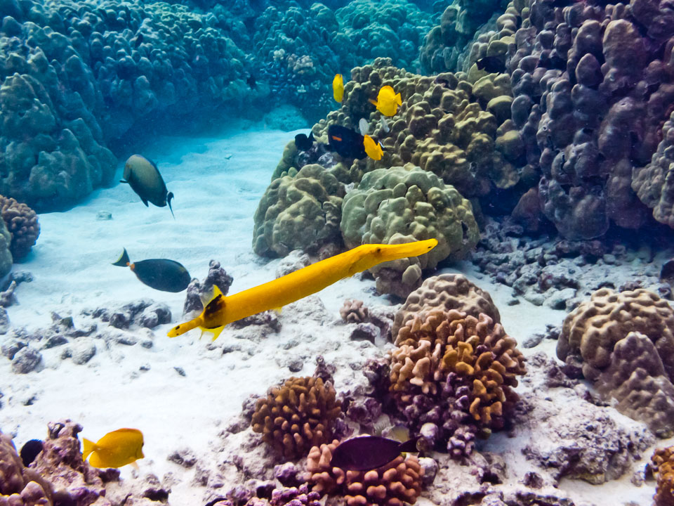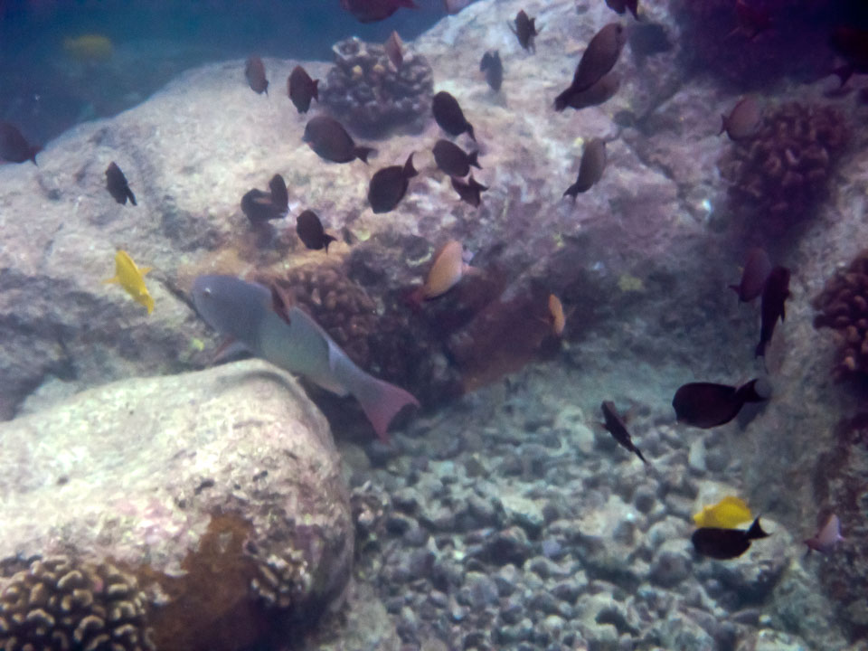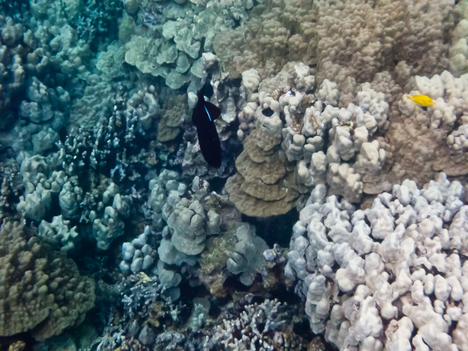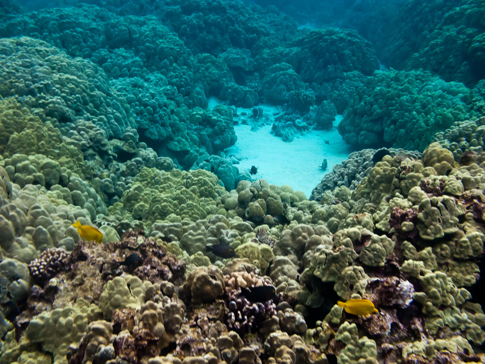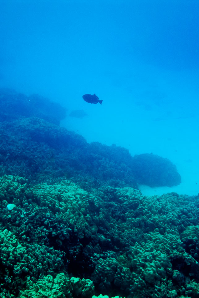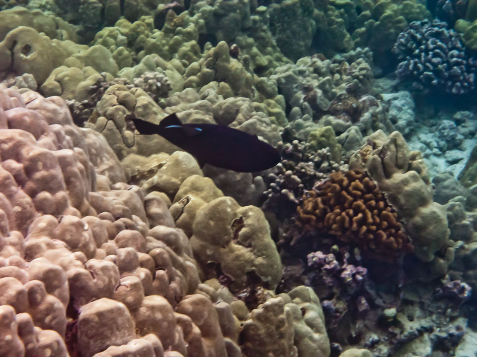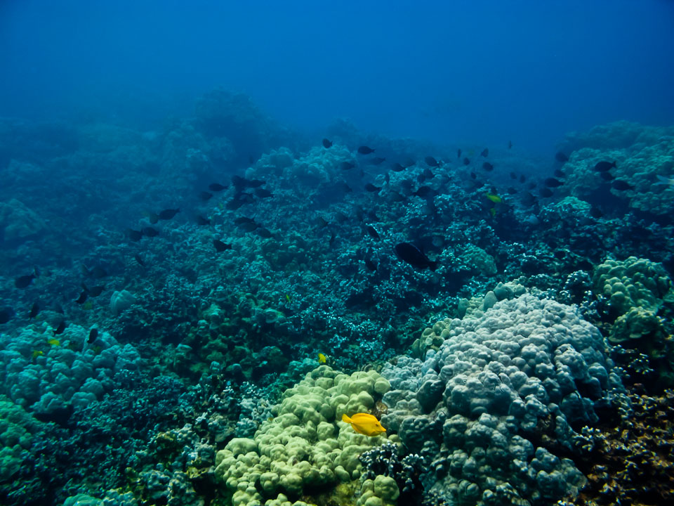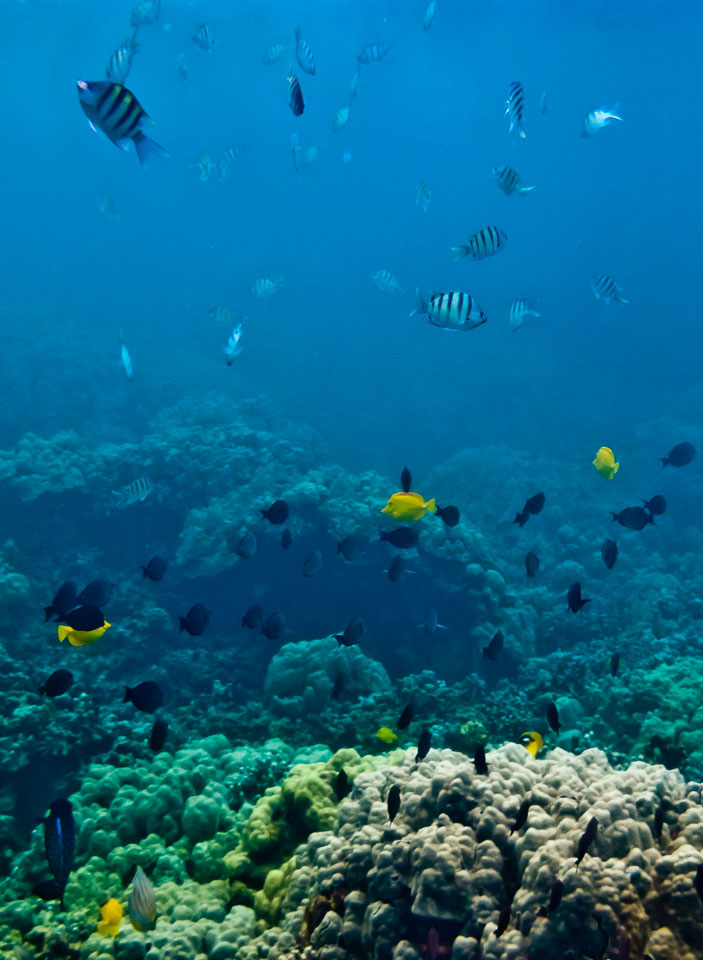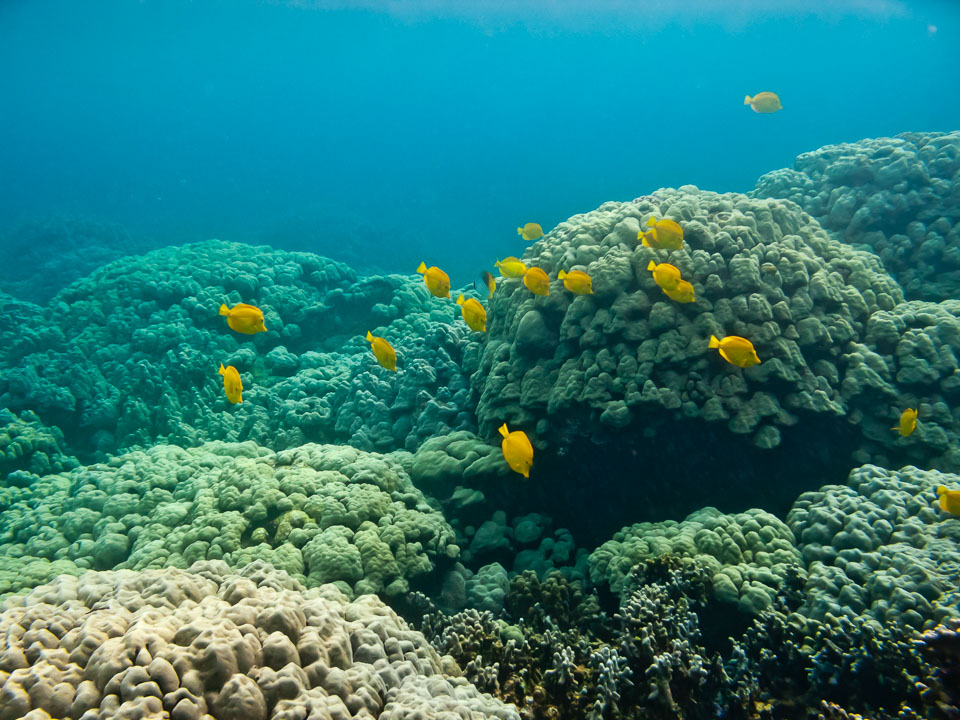 South Kona is shielded by the mountainous Maunaloa, making the waters on the southwest side of Hawaii’s Big Island calm and clear. A perfect example of this is at beautiful Honaunau Bay, also called Two-steps. “Two-steps” refers to a spot on the shoreline where the volcanic rock has been neatly worn away into a convenient “two-step” entry point for snorkelers and divers. Abundant fish and honu (Hawaiian green sea turtles) can be seen in Honaunau’s warm waters.