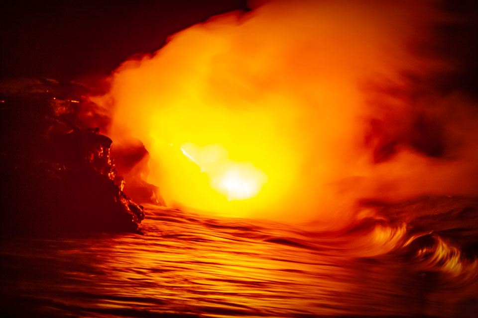 Images of lava; earth air fire and water. From the Kalapana subdivisions area, Kalapana bay ocean entry (a night hike over and active lava tube to then see the lave we walked over entering the sea) and the Halemaʻumaʻu lava pool at he Kīlauea summit