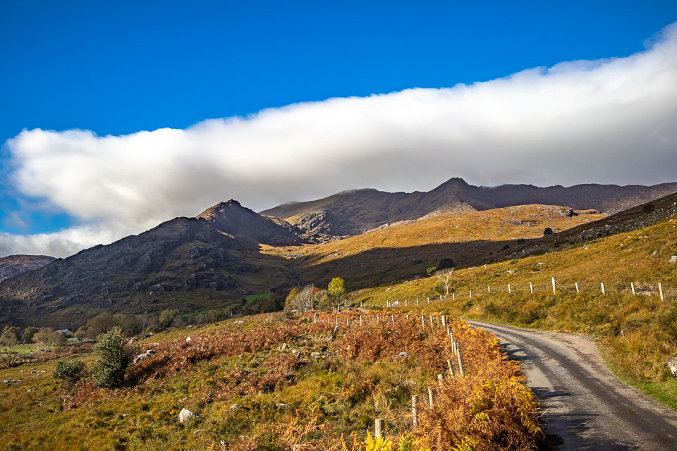 The Gap of Dunloe (from Irish: Dún Lóich, meaning "Lóich's stronghold", otherwise known as Bearna an Choimín meaning "gap of the common-land") is a narrow mountain pass in County Kerry, Ireland. The pass is located between the mountain ranges of the MacGillycuddy's Reeks (to the west) and the Purple Mountain Group (to the east). The road through The Gap, from Kate Kearney's Cottage down to Lord Brandon's Cottage, is about 11 kilometres (7 miles) in length, climbing and descending about 200 metres (650 feet) in total elevation change. Within the Gap are five lakes: Coosaun Lough, Black Lake, Cushnavally Lake, Auger Lake, and Black Lough (north to south). These lakes are connected by the River Loe. Between the first two lakes is an old arch bridge called the Wishing Bridge so named because it is said that wishes made while upon it are destined to come true.