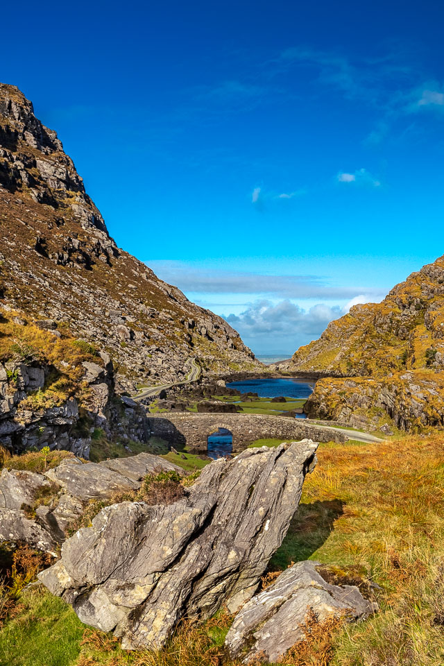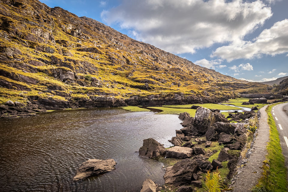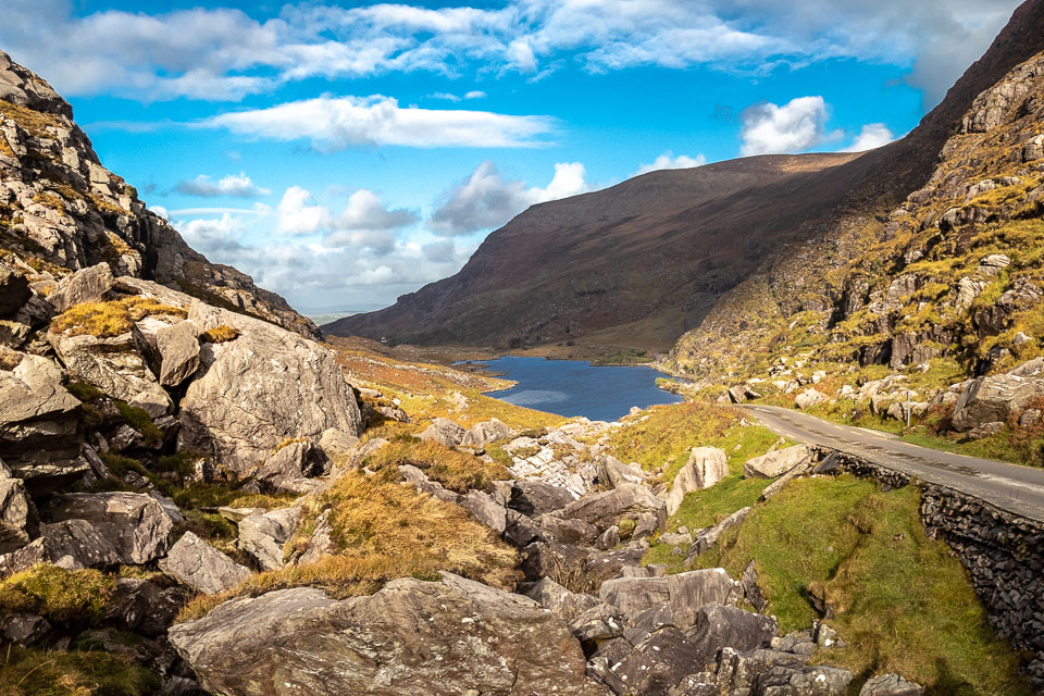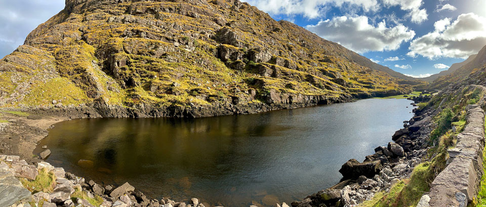 The Gap of Dunloe (from Irish: Dún Lóich, meaning "Lóich's stronghold", otherwise known as Bearna an Choimín meaning "gap of the common-land") is a narrow mountain pass in County Kerry, Ireland. The pass is located between the mountain ranges of the MacGillycuddy's Reeks (to the west) and the Purple Mountain Group (to the east). The road through The Gap, from Kate Kearney's Cottage down to Lord Brandon's Cottage, is about 11 kilometres (7 miles) in length, climbing and descending about 200 metres (650 feet) in total elevation change. Within the Gap are five lakes: Coosaun Lough, Black Lake, Cushnavally Lake, Auger Lake, and Black Lough (north to south). These lakes are connected by the River Loe. Between the first two lakes is an old arch bridge called the Wishing Bridge so named because it is said that wishes made while upon it are destined to come true.