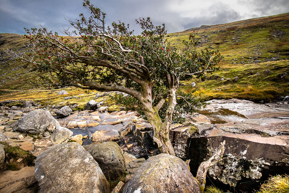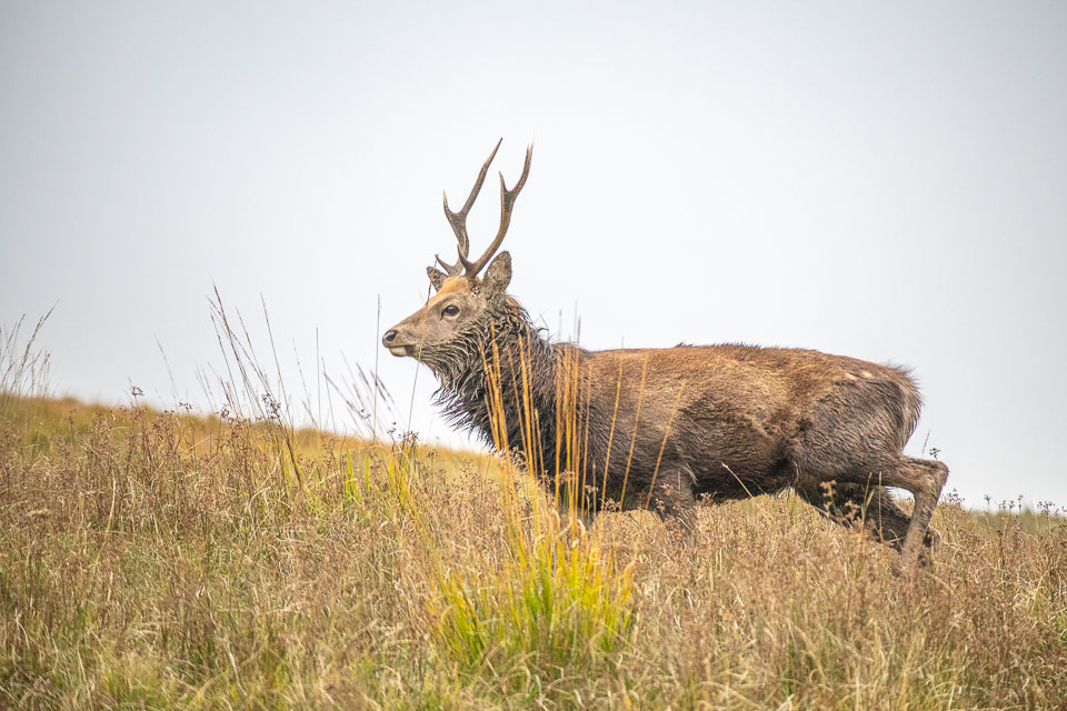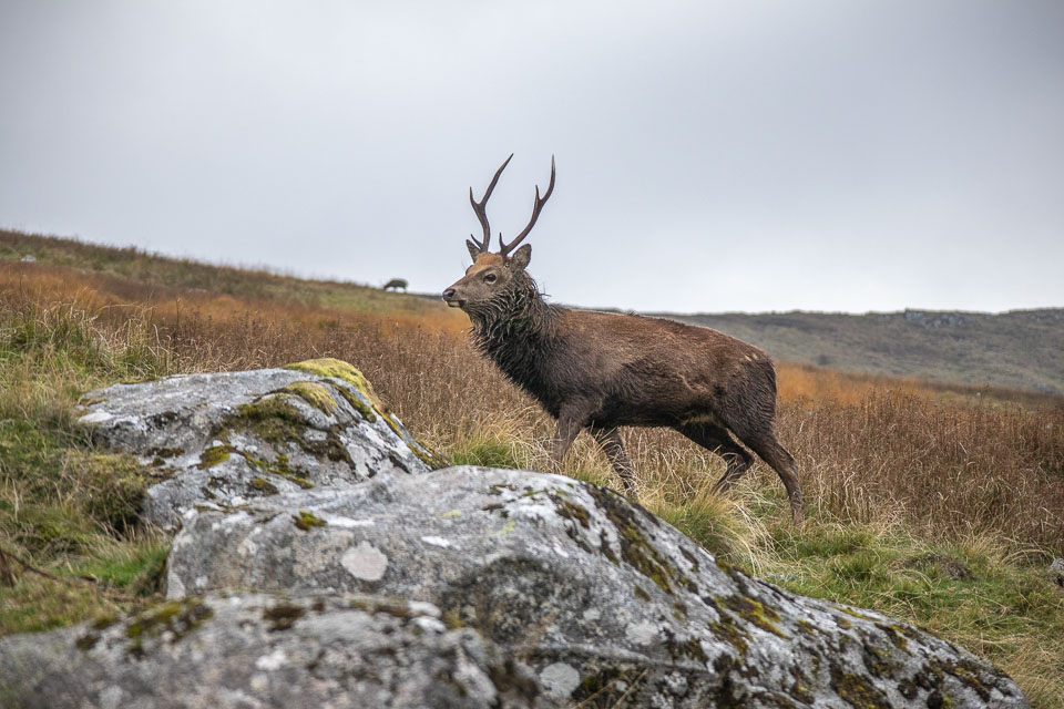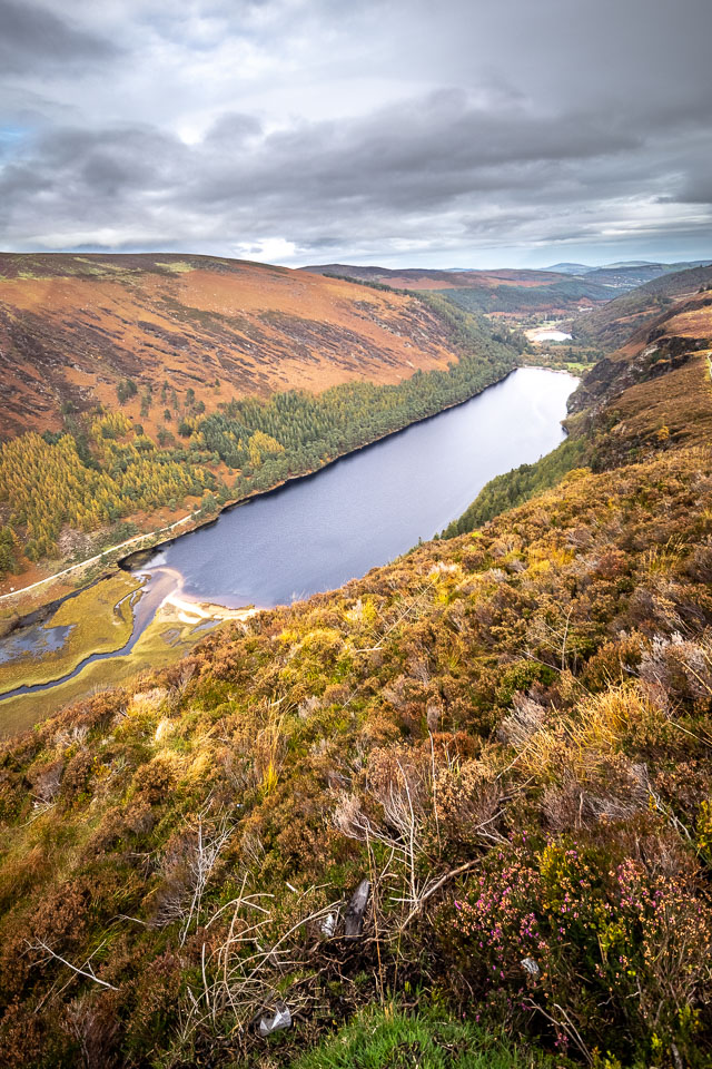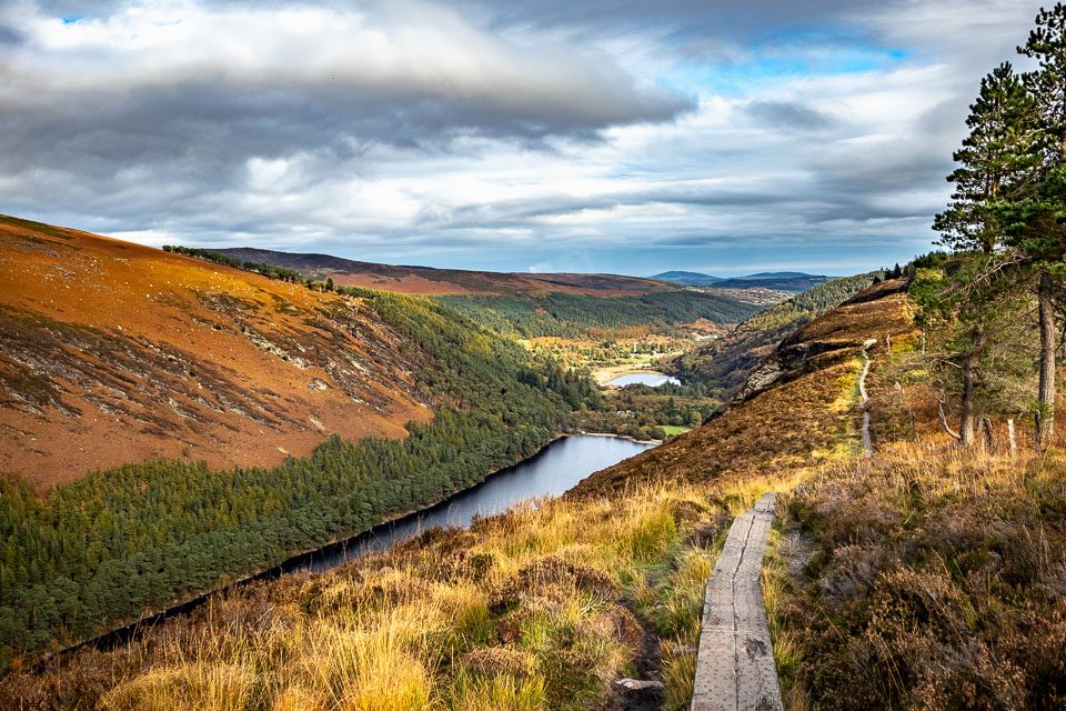 The trail we took (The Spinc trail, the white dots on this map ) climbs up and around the upper lake. The trail first goes though the ruins of Reefert church then climbs steeply up by the Poulanass Waterfall before joining a boardwalk. More than 600 wooden steps lead you to a viewing point overlooking the Upper Lake. A 3 mike long boardwalk skirts the top of the cliffs before descending through blanket bog and heath into the picturesque Glenealo Valley, home to a large herd of deer. A rough track then leads you back down into Glendalough Valley.