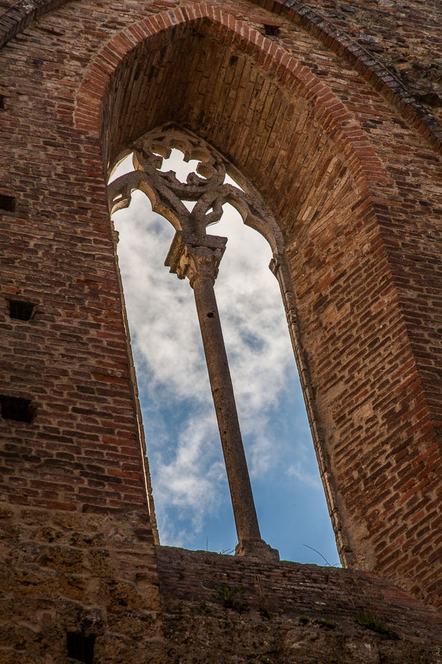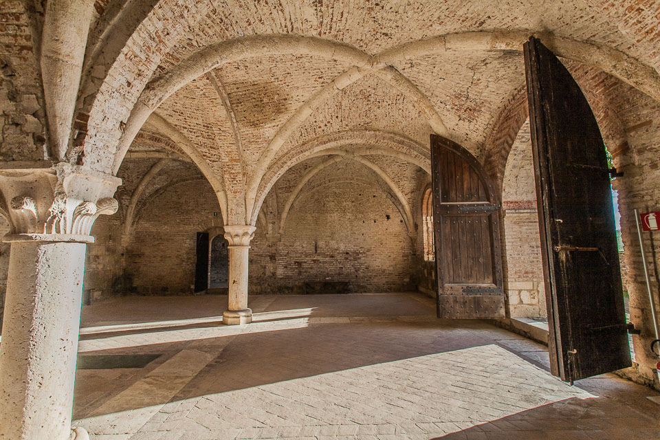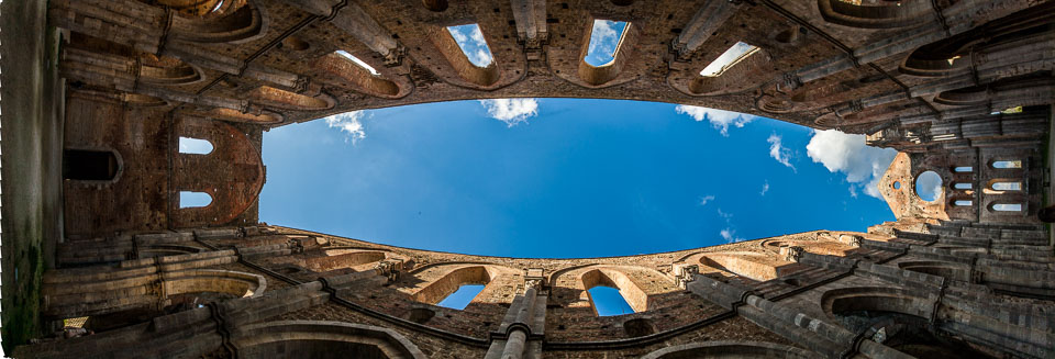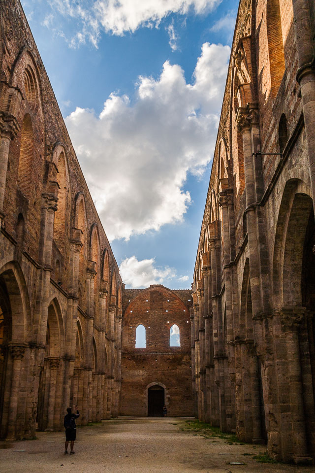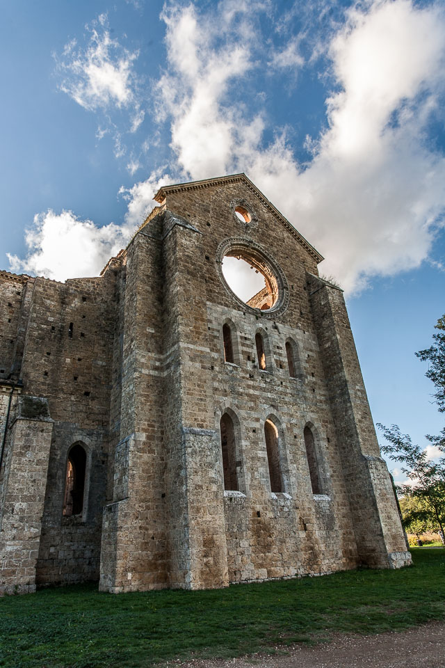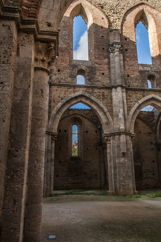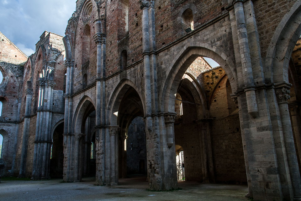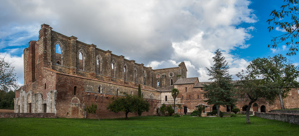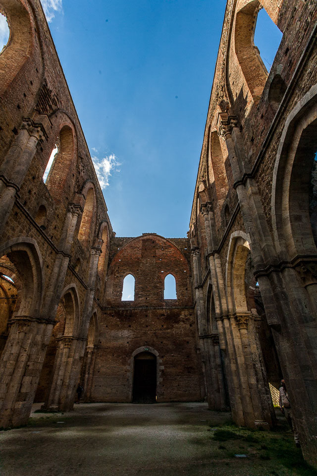 The original nucleus of the monastic complex Cistercian of Saint Galgano (Galgano Guidotti 1148-1181) is the hermitage of Montesiepi, built in Roman style as mausoleum of the Saint between the 1182 and the 1185. The hermitage began too small to contain the monks and the pilgrims, so in 1218 was decided to begin the construction of a new imposing Abbey in the plain below. The Abbey was built in the classic gothic forms of all the other Cistercian constructions, with plan at Latin cross with three aisles, rich of carved capitals and rose-windows, cloister, halls, bell tower. The abbey declined in the 16th century due to a long period of corruption that culiminated with an abbot selling the lead from the church roof, which soon collapsed. In the 1789 the great Abbey was definitively abandoned and become an enormous quarry of stones and columns for all the buildings of the area. Although the roof is still missing and the cloister has mostly disappeared, the abbey remains remarkably intact today.
