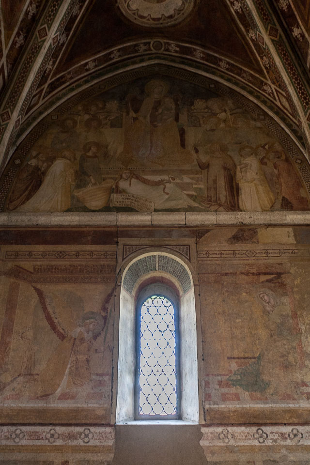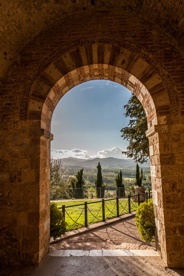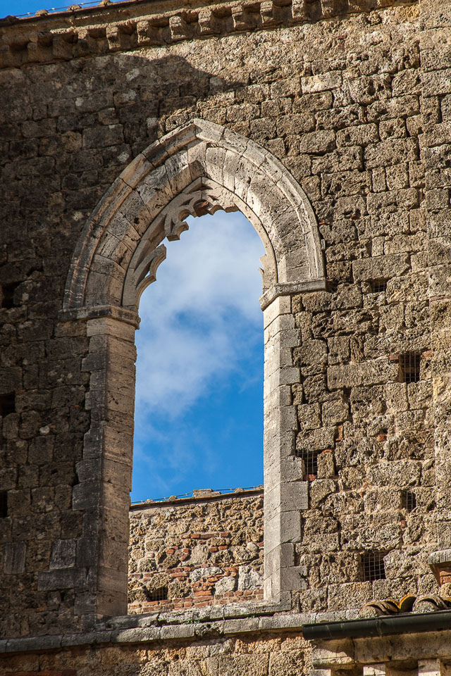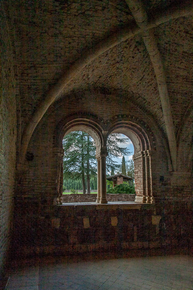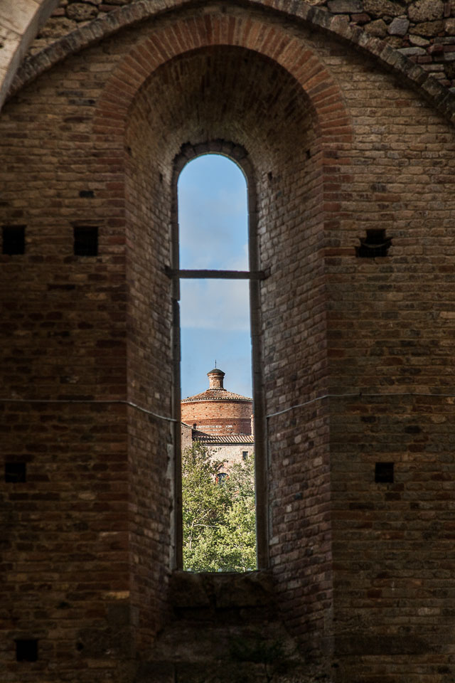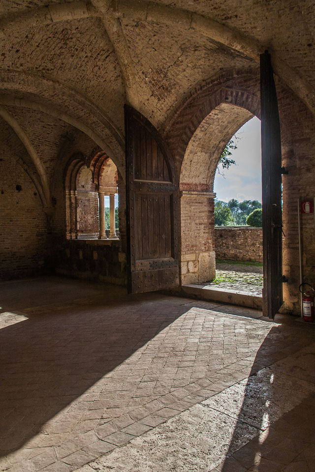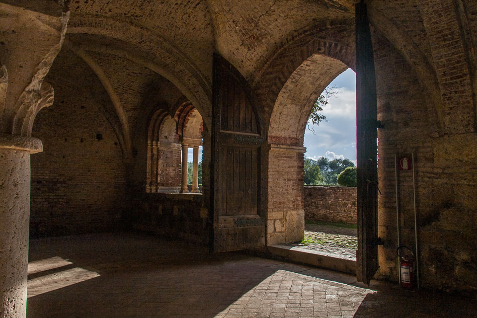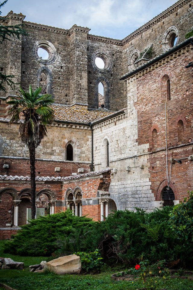 The original nucleus of the monastic complex Cistercian of Saint Galgano (Galgano Guidotti 1148-1181) is the hermitage of Montesiepi, built in Roman style as mausoleum of the Saint between the 1182 and the 1185. The hermitage began too small to contain the monks and the pilgrims, so in 1218 was decided to begin the construction of a new imposing Abbey in the plain below. The Abbey was built in the classic gothic forms of all the other Cistercian constructions, with plan at Latin cross with three aisles, rich of carved capitals and rose-windows, cloister, halls, bell tower. The abbey declined in the 16th century due to a long period of corruption that culiminated with an abbot selling the lead from the church roof, which soon collapsed. In the 1789 the great Abbey was definitively abandoned and become an enormous quarry of stones and columns for all the buildings of the area. Although the roof is still missing and the cloister has mostly disappeared, the abbey remains remarkably intact today.