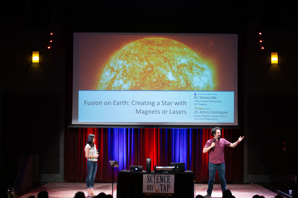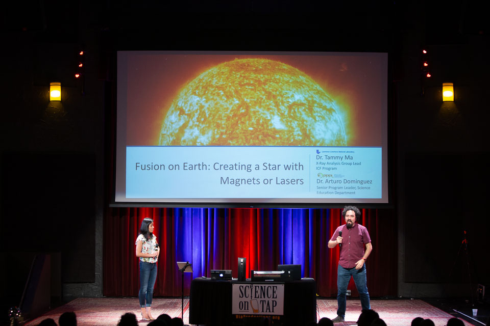 Fusion is the reaction that powers the sun. If controlled thermonuclear fusion can be harnessed here on Earth, it would provide a clean, sustainable, limitless energy source for all humankind. This is a grand scientific challenge, and scientists and engineers around the world are getting closer than ever. But how do you actually create a miniature star on earth? There are two options — magnets or lasers — but which one is best? At this Science on Tap, join us to learn about what fusion is, how we could use it, and hear two different ideas for how to make it. On the laser side, Dr. Tammy Ma, experimental plasma physicist from the Lawrence Livermore National Laboratory. On the magnet side, Dr. Arturo Dominguez, from the Science Education Department at the Princeton Plasma Physics Lab. Come learn plasma, fusion, possibilities for clean energy, and see some exciting demonstrations as well!